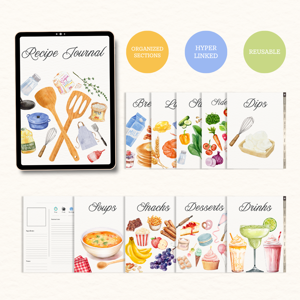 - Ready-to-Write Templates – Dedicated space for ingredients, directions, notes, and kitchen tips.